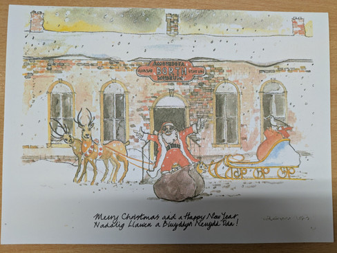 George and Jo, supported by a brilliant team of volunteers, have kept the museum welcoming and very busy from people waiting for trains to visitors who have come to visit Borth and the museum. Highlights for me included the model train from Hinterland and stories from the filming, plus displays of local artists’ work, one of which, by Neil Evans, even featured on a Christmas card they kindly gave me.